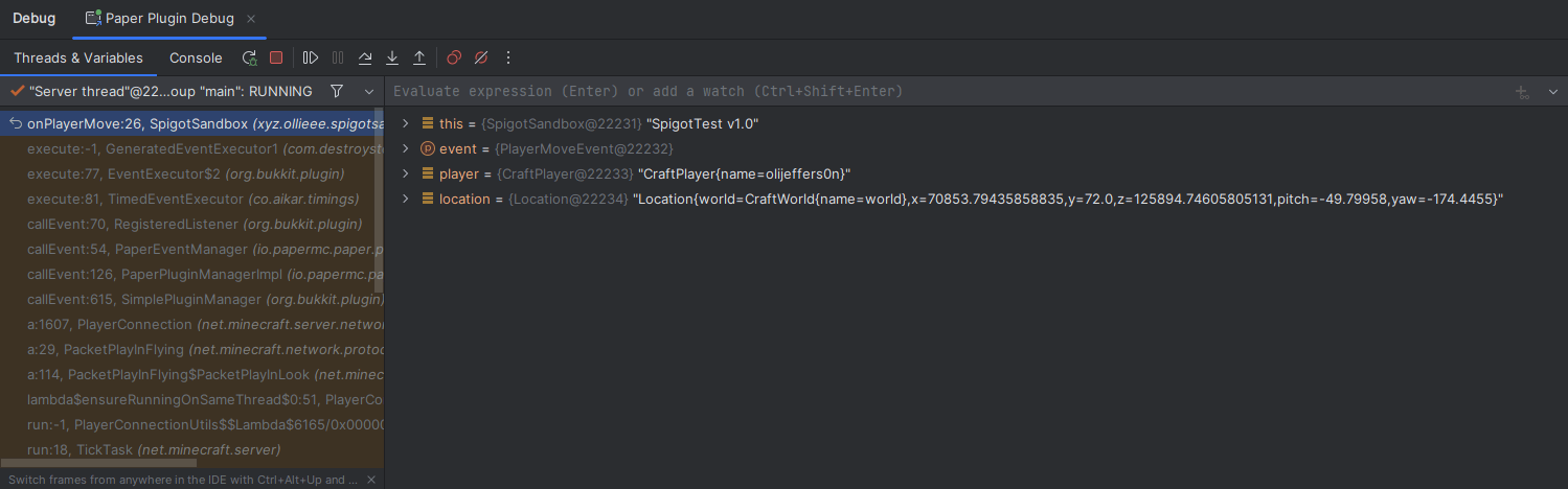 Direct debugging will allow you to run the server directly from your IDE, and will allow you to use breakpoints and step through your code. We can achieve this by using JPenilla's Gradle plugin to run the server directly from the IDE. See here for instructions on how to set up the plugin.